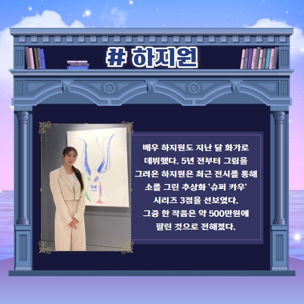배우 하지원도 지난 달 화가로 데뷔했다. 5년 전부터 그림을 그려온 하지원은 최근 전시를 통해 소를 그린 추상화 '슈퍼 카우' 시리즈 3점을 선보였다. 그중 한 작품은 약 500만원에 팔린 것으로 전해졌다.