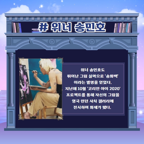 그룹 위너의 멤버 송민호도 뛰어난 그림 실력으로 '송화백'이란 별명을 얻었다. 지난해 10월 '코리안 아이 2020' 프로젝트를 통해 자신의 그림을 영국 런던 사치 갤러리에 전시하며 화제가 됐다.