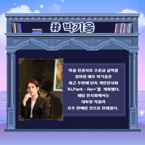 미술 전공자로 수준급 실력을 겸비한 배우 박기웅은 최근 두번째 단독 개인전시회 'Ki.Park - Re:+'를 개최했다. 대부분 작품이 모두 판매된 것으로 전해졌다.