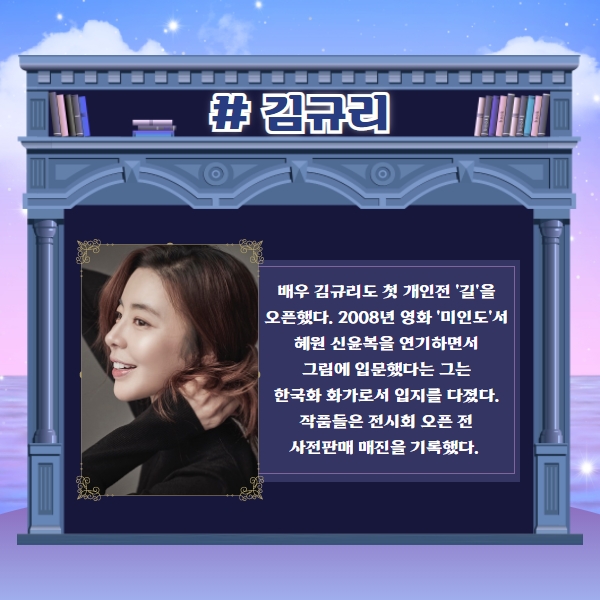 배우 김규리도 첫 개인전 '길'을 오픈했다. 2008년 영화 '미인도'에서 혜원 신윤복을 연기하면서 그림에 입문했다는 그는 한국화 화가로서 입지를 다졌다. 작품들은 전시회 오픈 전 사전판매 매진을 기록했다.