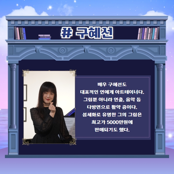 배우 구혜선도 대표적인 연예계 아트테이너다. 그림뿐 아니라 연출, 음악 등 다방면으로 활약 중이다. 섬세화로 유명한 그의 그림은 최고가 5000만원에 판매되기도 했다.