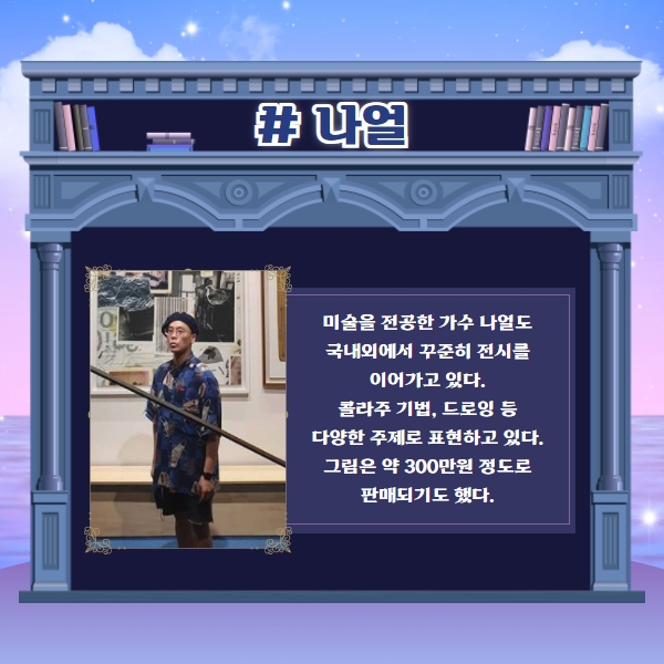 미술을 전공한 가수 나얼도 국내외에서 꾸준히 전시를 이어가고 있다. 콜라주 기법, 드로잉 등 다양한 주제로 표현하고 있다. 그림은 약 300만원 정도로 판매되기도 했다.