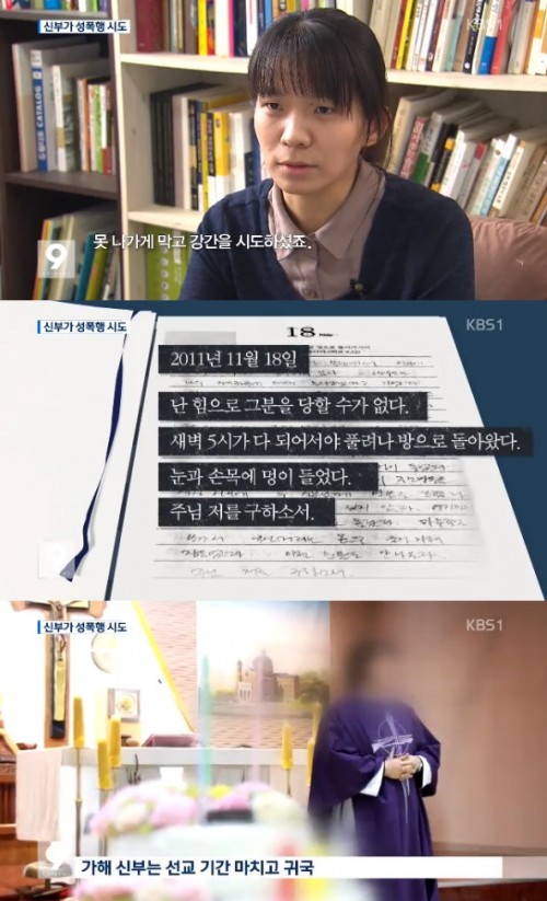 여성 신도 김민경씨는 이날 KBS ‘9뉴스’에서 지난 2011년 아프리카 남수단 선교 봉사활동 당시 한 신부로부터 성폭행을 당할 뻔한 피해를 봤다고 주장했다. 김씨는 "식당에서 나오려하는데 (한 신부가)문을 잠그고 강간을 시도했다"며 "손목을 잡힌 채 저항하다가 눈에 멍이 들기도 했다"고 밝혔다.
