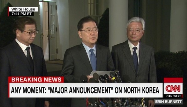 대북 특사단의 방북으로 김정은 위원장과의 4월 남북정상회담 개최를 확정한 문 대통령은 지체하지 않고 정 실장을 미국으로 보내 북미 정상간 대화 의지를 타진했다. 트럼프 대통령은 8일(현지시간) 정 실장을 통해 김정은 위원장의 만남 의사를 확인하자마자 "5월 안으로 만나겠다"고 통 크게 화답했다.