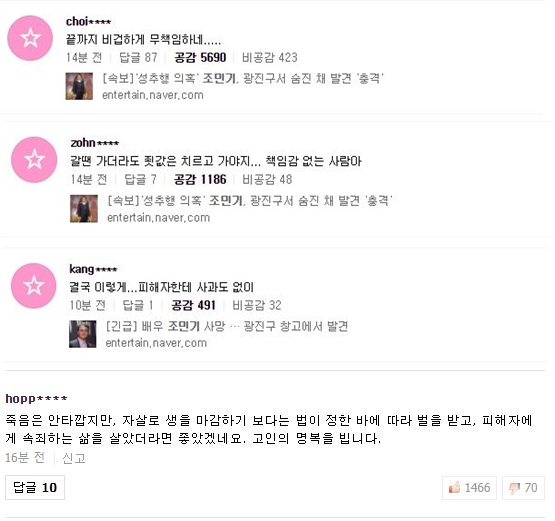 대부분의 네티즌들은 “법이 정한 바에 따라 벌 받고 피해자에게 속죄하는 삶을 살았더라면”(hopp****), “결국 피해자에게 사과도 없이”(kang****), “죗값은 치르고 가야지... 책임감 없는 사람아”(zohn****) 등 경찰 조사를 앞둔 상황에서 극단적인 선택을 한 조민기에게 안타까움과 함께 “무책임하다” “는 반응을 보이고 있다.