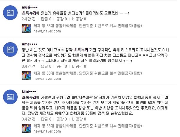 이 밖에도 “초록누리 가면 구체적인 유해 리스트라고 표시해 놓은 것도 아니고 명확히 검색으로 확인하기도 힘들게 해 놨다 (orne****)” “뭐가 유해성분 나온건지 알 수 없게 해놨어”(sgi2****) “초록누리에 있는 게 유해물질 썼다는거? 들어가봐도 모르겠네”(musi****) 등 의견이 잇따랐다.