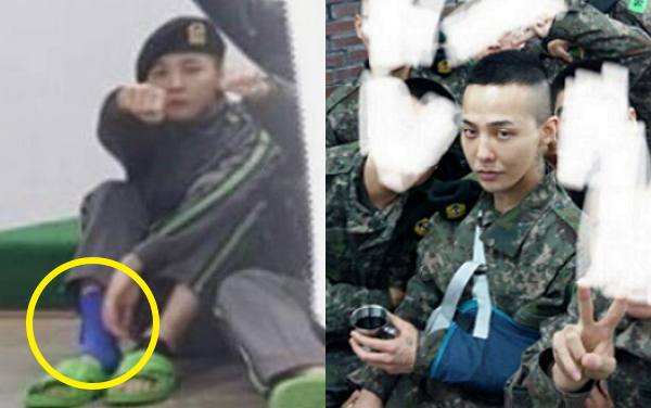 이어 20일 공개된 또 다른 훈련소 사진에서는 왼쪽 팔에 깁스를 하고 있는 것이 드러났다. 이에 일부 팬들은 지드래곤이 군 생활 도중 부상을 당한 것이 아니냐는 우려의 목소리를 내고 있다.