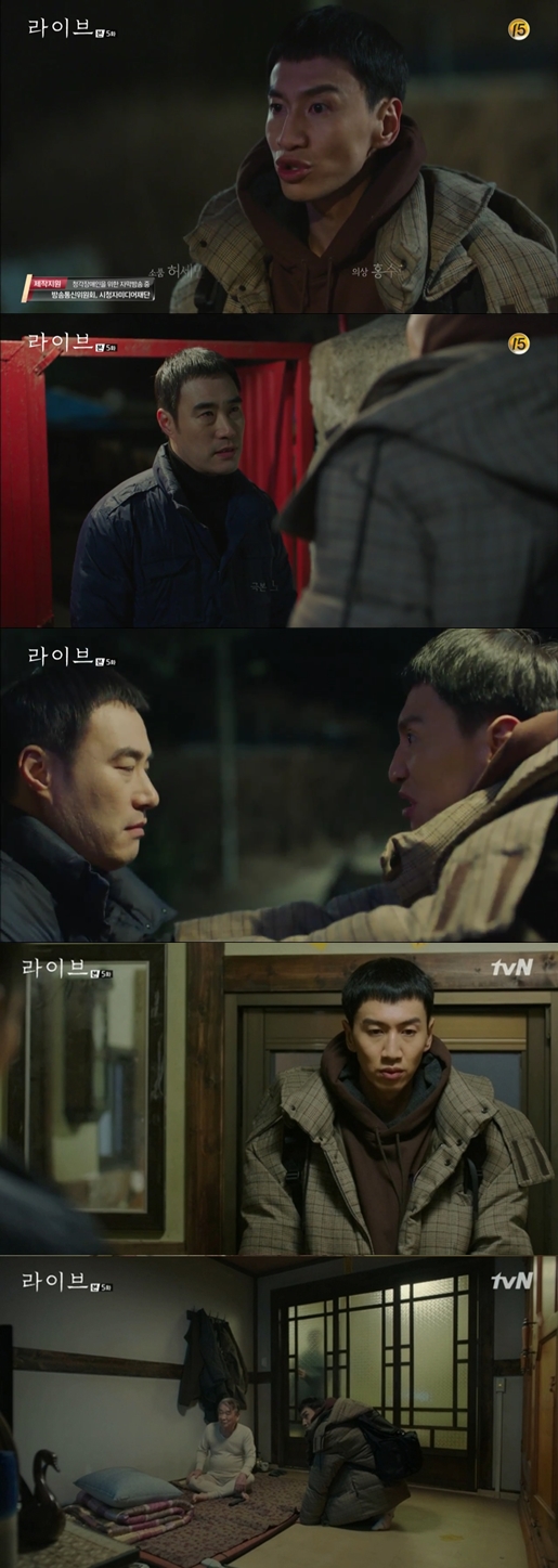 24일 밤 9시 방송된 tvN '라이브'에서는 오양촌(배성우)의 집앞까지 찾아가 분노를 표출하는 염상수(이광수)의 모습이 그려졌다. 이날 염상수는 자신의 점수가 왜 '하'이며 "매뉴얼데로 다 따라가다가 사람죽으면 누가 책임지냐"며 오양촌의 멱살을 잡고 화를 냈다. 이에 오양촌은 "니 점수가 왜 하인지 아직도 모르겠냐"고 되물었다.