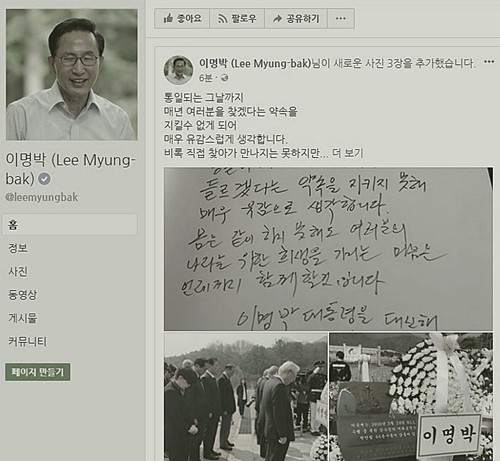 이런 가운데 이 전 대통령은 천안함 8주기인 이날 "통일되는 그날까지 매년 여러분을 찾겠다는 약속을 지킬수 없게 되어 매우 유감스럽게 생각합니다"라는 친필 메시지를 김효재 전 청와대 정무수석을 통해 자신의 페이스북에 올렸다.