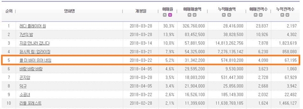 화제의 한국영화와 블록버스터에 이어 가장 높은 예매율을 기록하고 있는 ‘콜 미 바이 유어 네임’은 현재 상위권을 차지한 ‘레디 플레이어 원’ ‘7년의 밤’ ‘지금 만나러 갑니다’ ‘퍼시픽 림: 업라이징’보다 상대적으로 적은 스크린수와 상영횟수에도 불구하고 꾸준하게 실시간 예매율 순위를 뒤따르고 있어 눈길을 끈다. 이외에도 상영영화 일간검색어 3위, 네이버 영화 관람객 평점 9.39를 기록하고 있어 열기는 계속 이어질 전망이다.