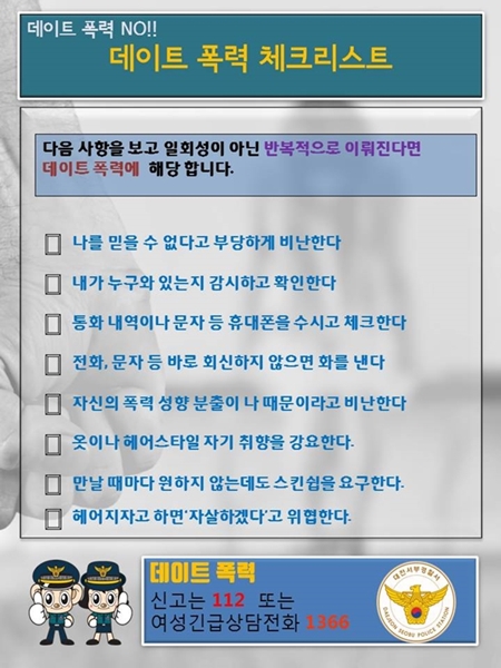 체크리스트엔 ‘다음 사항이 일회성이 아닌 반복적으로 이뤄진다면 데이트 폭력에 해당한다’는 글귀가 적혀있다. 피해자들이 자각하지 못하는 데이트 폭력에 대해 한 번쯤 생각해볼 수 있게 만든다.