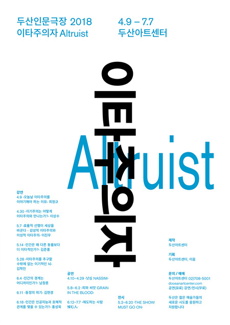 사회현상에 대해 인문학 강연부터 공연, 전시까지 다각도로 고민해볼 수 있는 통합 기획 프로그램 ‘두산인문극장’이 올해도 관객을 찾아온다. 개인적 삶에 대한 욕구가 강한 요즘, ‘이타주의자’를 주제로 4월9일부터 4개월간 ‘어떻게 이웃과 함께 살 것인가’에 대해 이야기한다.
