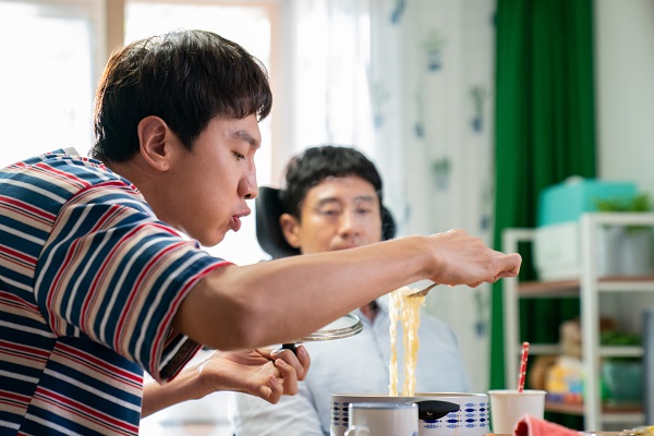 머리 좀 쓰는 형 세하(신하균)와 몸 좀 쓰는 동생 동구(이광수), 피 한 방울 섞이지 않았지만 20년 동안 한 몸처럼 살아온 두 남자의 우정을 그린 휴먼 코미디 영화 ‘나의 특별한 형제’의 첫 번째 명대사&명장면은 세하, 동구의 라면 먹방신이다. 목 아래로는 움직일 수 없는 세하를 위해 형의 손과 발이 돼주는 동구는 평상시 세하를 위해 빨대 각도까지 세심하게 조절하지만라면 앞에서는 “뜨거워”라며 세하의 간절한 눈빛을 외면해 폭소를 자아낸다.