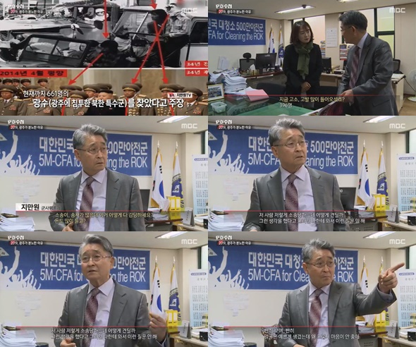 지만원은 제작진을 가리키며 “빤히 보여, 얼굴은 예쁘게 생겼는데 마음이 왜 그렇게 안 좋아”라며 북한군 개입설을 계속 주장했다.