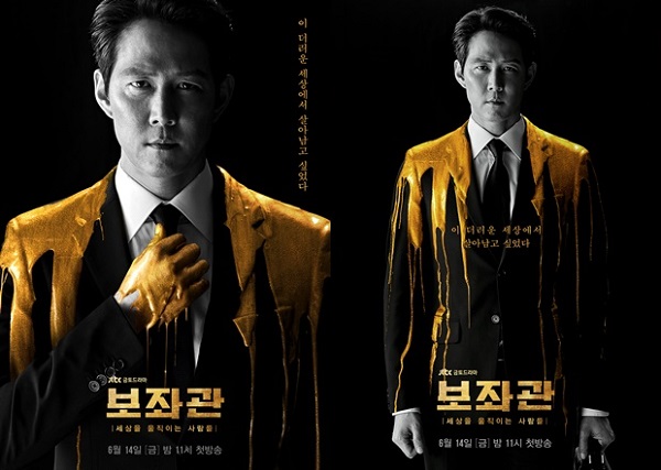 6월 14일 첫방송되는 JTBC 금토드라마 ‘보좌관’이 티저포스터와 티저영상을 공개했다. 이정재가 입은 블랙 수트를 타고 흘러내리는 금빛이 의미하는 것은 무엇일지 궁금증을 자아낸다.