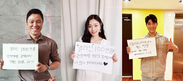오늘(28일) 개봉 6일째가 되자마자 100만 관객을 돌파한 영화 디즈니 '알라딘'(수입/배급: 월트디즈니컴퍼니 코리아)이 대한민국 최고의 뮤지컬 배우 정성화, 민경아, 신재범 3인방의 100만 관객 돌파 감사 인증샷을 공개했다.