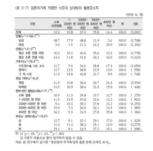 특히 이같은 현상은 거주 지역별로 격차를 나타내 눈길을 끌었다. 수도권(서울, 인천, 경기)이 광역시나 그 외 시도보다 결혼 상대방의 적절한 소득수준을 높게 생각하는 경향을 보였다.