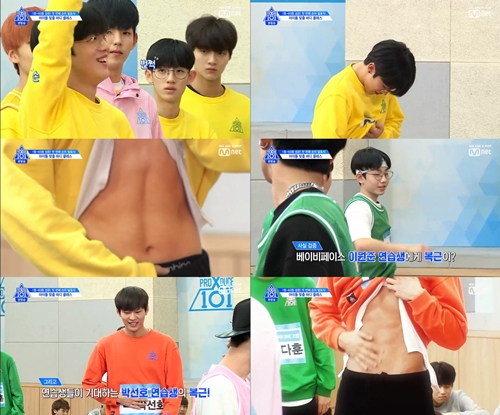 특히 베이비 페이스의 이원준 연습생도 선명한 복근을 공개해 감탄을 자아냈다. 그 중에서 연습생들은 “박선호 형 복근이 멋있다”며 그의 복근에 열광했다.