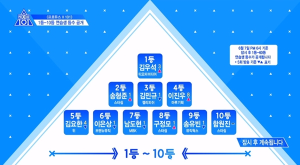 방송이 시작되자마자 실시간 등수 1위에서 10위가 공개돼 시청자들을 놀라게 만들었다. 1위는 김우석, 2위 송형준, 3등 김민규, 8단계 급상승한 4등 이진우, 첫 번째 순위발표식에서 1위를 차지한 김요한이 5등을 차지했다.