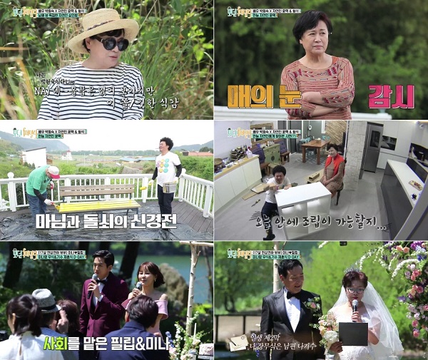 본격적으로 진행된 ‘미나 맘’ 장무식과 남편 나기수의 재혼식에서는 미나, 류필립 부부가 사회를 도맡았다. 주례 없는 재혼식에 VCR을 지켜보던 이수근은 “이분들에게 누가 인생을 논하겠느냐”라고 되물어 폭소를 안겼다. 이후 재혼식 장소를 빌려준 노주현이 깜짝 등장해 축사를 전했고 혼인 서약에서 장무식은 돋보기안경을 공수해 70대의 나이를 ‘인증’했다. 마지막 행진에서는 김연자의 ‘아모르 파티’가 흘러나와 흥겨움을 더했다. 미나는 어머니의 행복한 모습에 연신 미소 짓다가도 하늘에 계신 아버지를 생각하며 눈물을 흘려 류필립과 스튜디오 MC들의 따뜻한 응원을 받았다.