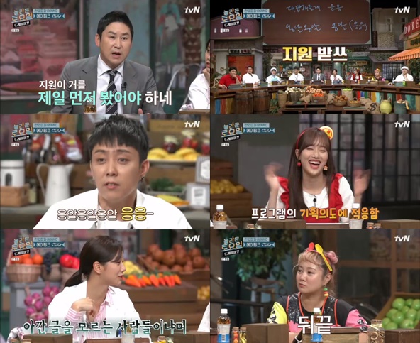 8일 방송된 tvN ‘놀라운 토요일-도레미마켓’에서 ‘고교급식왕’으로 돌아온 은지원과 과즙미 넘치는 에이프릴 이나은이 출연해 가사 맞히기에 도전했다.