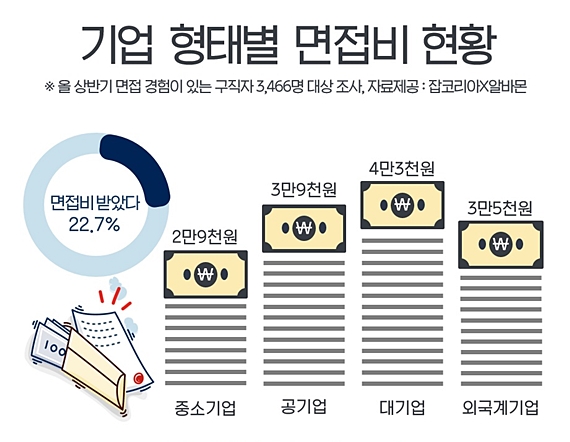 잡코리아가 알바몬과 함께 올해 면접 경험이 있는 면접자 3466명을 대상으로 ‘면접비 지급 현황’에 대해 조사한 결과, 22.7%만이 ‘면접비를 받았다’고 응답했다. 나머지 77.3%는 입사지원 했던 기업으로부터 면접비를 받지 못한 것으로 나타났다.