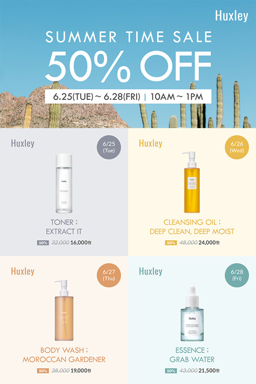 본격적인 바캉스 시즌이 시작되는 6월을 맞아 컨템포러리 뷰티 브랜드 헉슬리가 타임세일을 진행한다.