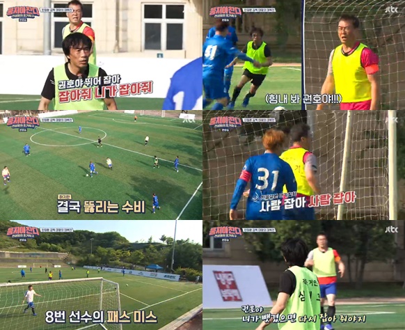 심권호는 투덜대다가도 이만기의 말을 듣자마자 상대 공격수에게 돌진했다. 하지만 수비는 결국 뚫렸다. 상대 선수의 패스 미스로 위기를 벗어나자 이만기는 “권호야 니가 뺏겼으면 다시 잡아줘야지”라고 잔소리를 해 웃음을 자아냈다.
