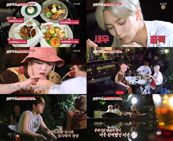 세 사람은 인도네시아의 다양한 전통 음식을 주문해 새우 한 쪽마저 나눠 먹으며 훈훈한 모습을 자랑했다. 정한은 "오바마 대통령이 왜 이걸 먹었는지 알겠다"며 만족한 표정을 지었다. 식당에 도착하자 춤을 추며 기뻐한 에스쿱스는 음식을 입에 넣고 "여행 초보자에게 낯설지 않은 맛"이라며 인도네시아 음식을 극찬했다.