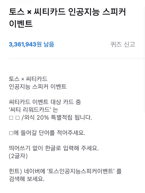 16일 토스 행운퀴즈 홈페이지에서는 토스와 씨티카드 인공지능 스피커 이벤트에 대한 문제가 나왔다.